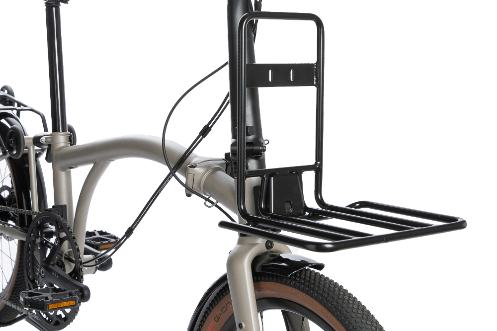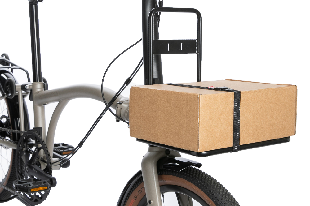 FRONT RACK XL ist die größere Version des sehr minimalistischen FRONT RACK. Die Ladefläche ist breiter und der rückseitige Bügel ist höher. Es lässt sich ebenso spielend über dem an der Front angebrachten Brompton Trägerblock einklicken und abnehmen. Der Träger kann ebenfalls im gefalteten Zustand am Faltrad verbleiben. Auf dem Träger lassen sich Taschen aber auch Kisten transportieren. Ein passender Spanngurt ist als Zubehör erhältlich.